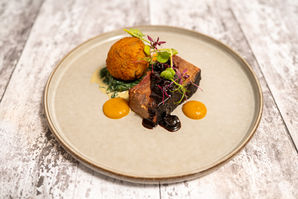 Fire-cracker BBQ Beef Brisket or Honey mustard chicken with charcoal butter Served with: Dauphinoise bubble & squeak bon bon, smoky root puree & wild creamed greens